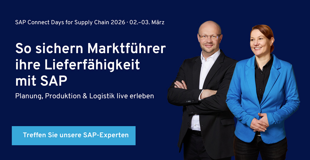 Treffen Sie uns auf den SAP Connect Days for Supply Chain 2026 – dem zentralen Treffpunkt für Entscheiderinnen und Entscheider aus Planung, Produktion und Logistik. Gemeinsam mit SAP und führenden Unternehmen zeigen wir, wie KI-gestützte Lösungen und Cloud-Technologien dabei helfen, Supply Chains leistungsfähiger, transparenter und resilienter zu machen.